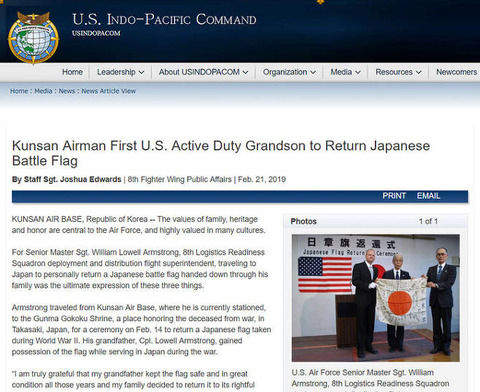 米国の退役軍人が持っていた寄せ書き日の丸が日本に返還されるというニュースは初めてではないのですが、米軍が公式のホームページで比重あるように扱ったのは類例がありません。