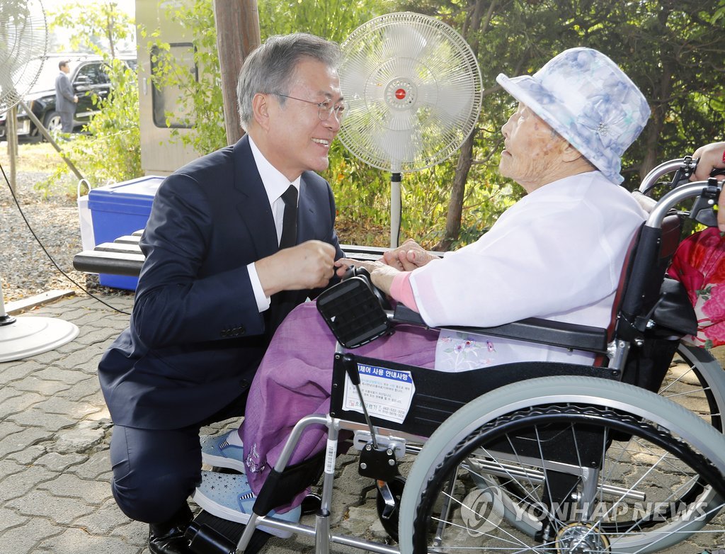 ▼昨年8月14日、国立墓地「望郷の丘」で文在寅(ムン・ジェイン)大統領とあいさつするクァクさん>>1