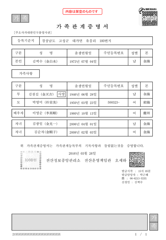 添付は、韓国の戸籍に相当する書類のひとつ、「家族関係証明書」のサンプルです。