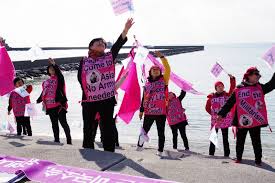 韓国から来沖した「韓国オモニ会」のメンバーが1月25日、米空軍嘉手納基地の第一ゲートに出現し、米軍関係者の車両の通行を妨害しました。