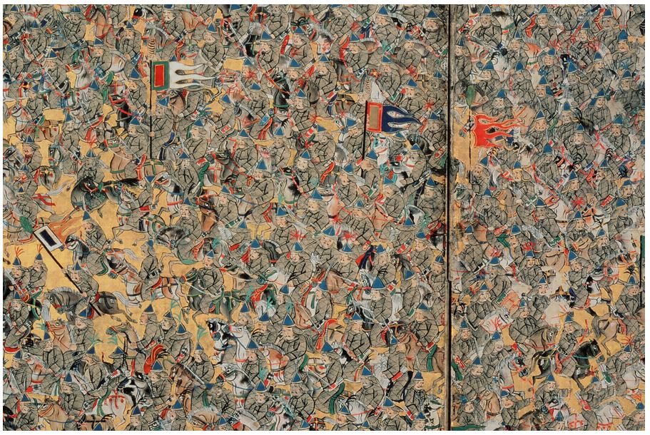当然ながら、倭人を仕留めるのは難しいので朝鮮人同士で殺し合う『偽首』が横行したという。朝鮮軍陣図屏風(一部拡大)