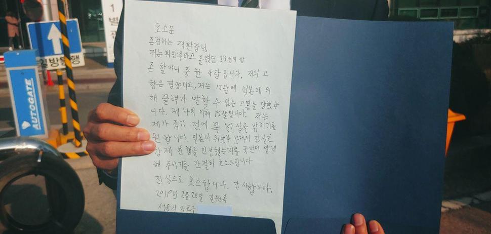 「尊敬する裁判長、私は慰安婦と呼ばれた23人の生存祖母の一人です。私の故郷は、平壌であり、私は13歳のときに話すことができない苦しみを受けました。私の年齢今92歳です。私は私が死ぬ前に必ず真実を明らかにするを望んでいる。」
