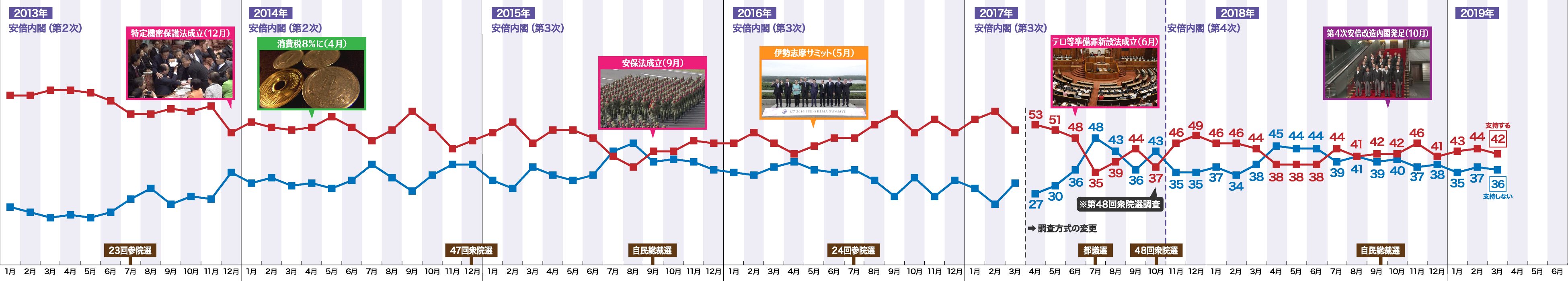 沖縄(沖繩)米軍基地移転問題で浮上した「不通政治」との統計不正スキャンダルによる信頼の低下に足首が取れ一方、過去の歴史問題などを素材にした「韓国叩き」の効果が弱くなった結果と分析される。