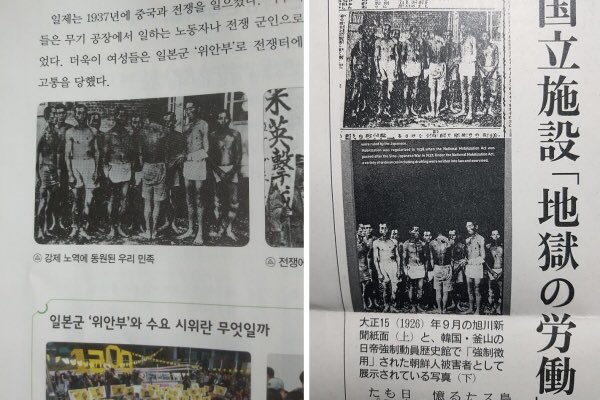 11日、歴史関連の民間研究所である国史教科書研究所によると、今年小学校6-1の54ページに"強制労働に動員されたわが民族"という説明写真が掲載された。 さらに、該当写真は14年から昨年まで、多数の高校の韓国史教科書にも掲載されたという。