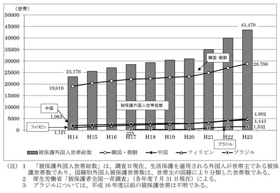 また、被保護外国人世帯数の平成 14 年度から 23 年度までの間の推移をみると、生活保護対象の在留資格保有者の減少傾向とは逆に、その数は増加傾向(2.3 万世帯→4.3 万世帯)にあり、特にリーマン・ショックがあった 20 年度以降その傾向が顕著になっている。