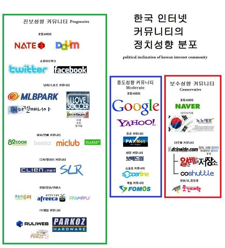온라인에서는 그 정도가 더 심해서 일베가 탄생하기 전에는 우파의 정치적 스탠스를 가진 사이트가 없었다