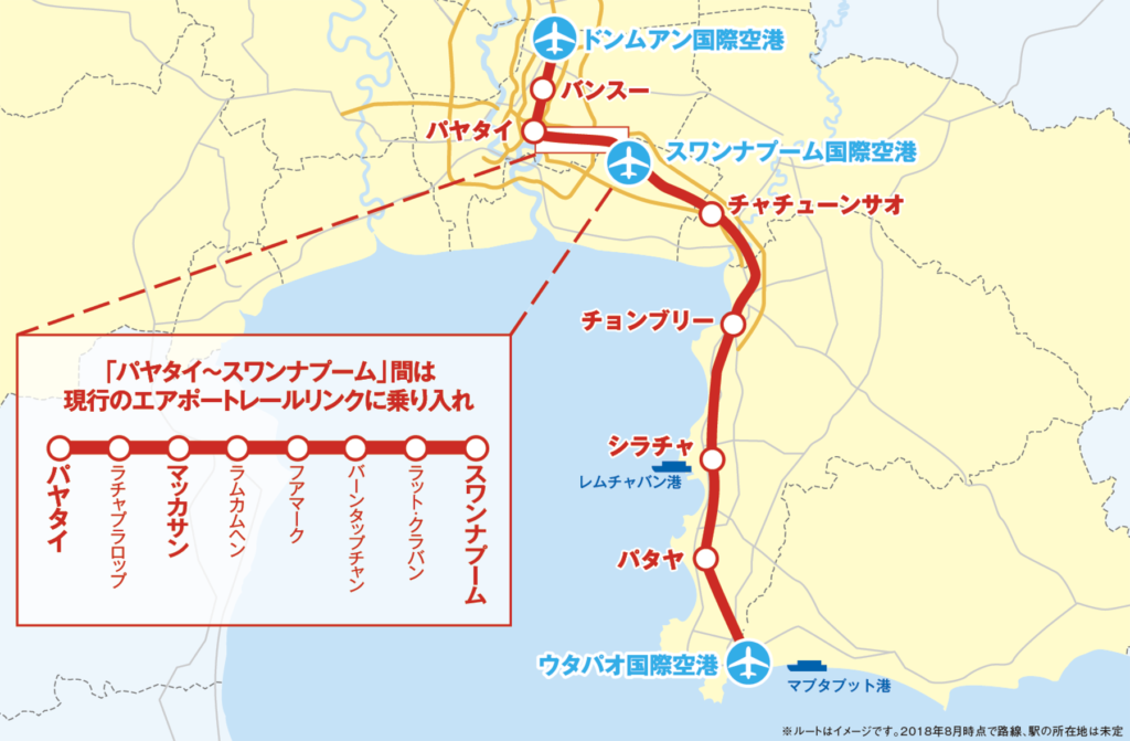 これにはタイ高速鉄道の所謂「EEC路線」を含みます。この路線はバンコクのドンムアン空港、スワンナプーム空港、ラヨーンのウタパオ空港の3つの空港を結ぶ路線で、融資の対象はこの路線の、総額2240億バーツの高速鉄道建設プロジェクトです。