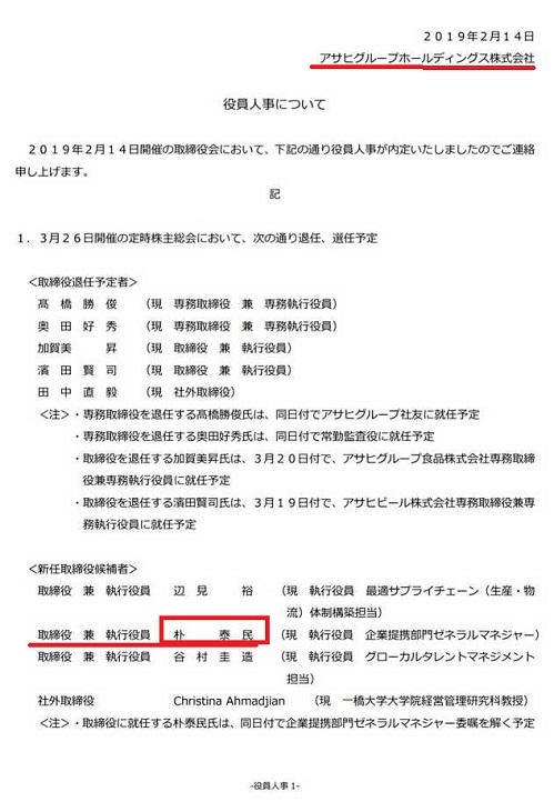 一族みなごろしにすべきアサヒビール新取締役に朴秦民氏