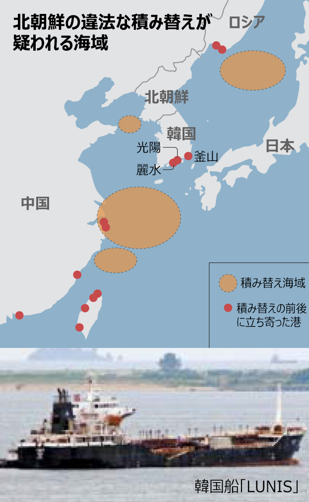 今回の制裁で注意リストの対象に韓国船籍の船舶(LUNIS)が初めて含まれたのも異例で、注目する必要があるという指摘だ。「LUNIS」は北朝鮮のタンカーと石油を不法瀬取りしたと疑われる第3国船舶18隻に含まれた。「LUNIS」は5412トンの石油化学製品の運搬船で釜山(プサン)A海運会社が所有主だ。韓国船舶を直接制裁したわけではないが、監視の対象に入れたものだ。財務省は不法瀬取り船舶の寄港地として釜山・光陽(クァンヤン)・麗水(ヨス)港など3港を地図に表記したりもした。