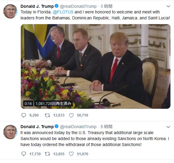 トランプ氏はツイッター(Twitter)に「財務省がきょう、現行の対北朝鮮制裁に加え、大規模な追加制裁を発表した。私はきょう、これら追加制裁の撤回を命じた」と投稿した。