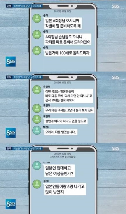 一ヶ月後、クリスマスイブ、日本のある建設関連企業の代表A会長が韓国に入ってきた勝利と麟錫などが入っている段トクバンは「日本人たちと6人出てたくさん残っている」などの性接待を暗示する言葉が出てきた。パーティー翌日麟錫はただトクバンメンバーに「プレゼントを送ってあげる」とアドレスを呼ぶと言うこともある。SBS側は女性を送信くれるという言葉の解釈と話した。