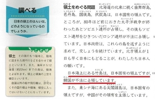 東京書籍(5年)は竹島について「日本固有の領土ですが、韓国が不法に占拠しているため、日本は抗議を続けています」と記述。日本文教出版(6年)も尖閣について「日本固有の領土で、その領有をめぐって問題がないにも関わらず、中国も自国の領土であると主張しています」とし、いずれも政府見解に沿って内容を充実させている。地図には検定意見が付かないが、竹島と尖閣には申請のあった2点とも「固有の領土」と明記された。