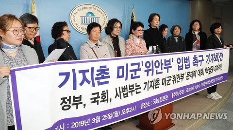 (ソウル=聯合ニュース)キムジュヒョン記者=共に民主党ユ・スンヒ(左から四番目)、正しい未来党キム・スミン(右から5番目)議員と基地村女性人権連帯、京畿女性連帯の関係者らが25日、国会政論館で「基地村米軍慰安婦の立法を促す記者会見」を開いて発言している。