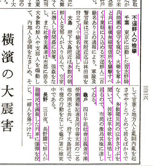 司法当局が、震災時混乱を避けるために朝鮮人の犯罪報道を差し止めていたことを認める。同時に朝鮮人による略奪、強姦、殺人、爆弾や毒物(井戸に投げ込むというアレ)携帯などの犯罪行為が多発していた事も認める