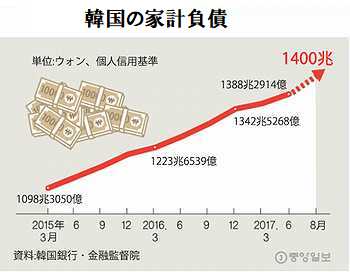 韓国家計負債の進捗グラフ・・・これほどキレイな「右肩上がり」のグラフは小学校高学年の算数の授業以来かも・・・。消費者金融大手の三和貸付、韓国撤退準備か
