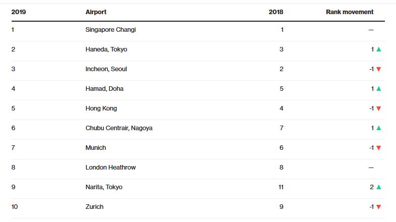 カタール・ハマド国際空港、香港国際空港、日本・中部国際空港、ドイツ・ミュンヘン空港、英国・ロンドン・ヒースロー空港、日本・成田国際空港、スイス・チューリッヒ空港が4~10位にランクインした。