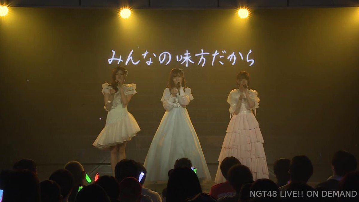 オープニング曲こそNGTの「Maxとき315号」だったが、10曲目までAKB48や派生ユニットなどの楽曲が続き、NGT楽曲のない異例の公演が続いている。