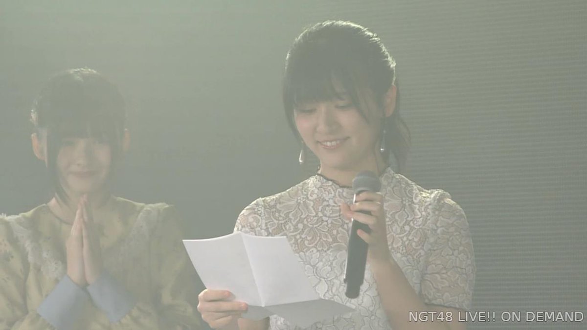 「この数ヶ月で今までの楽しかったことも、うれしかった遠くに行ってしまうようなつらい思いを経験したと思います。みんなに、そんな思いをさせてしまったことが、NGT48のメンバーとして、すごく悲しかったです。大切な、みんなのことを守れなくて、ごめんなさい」