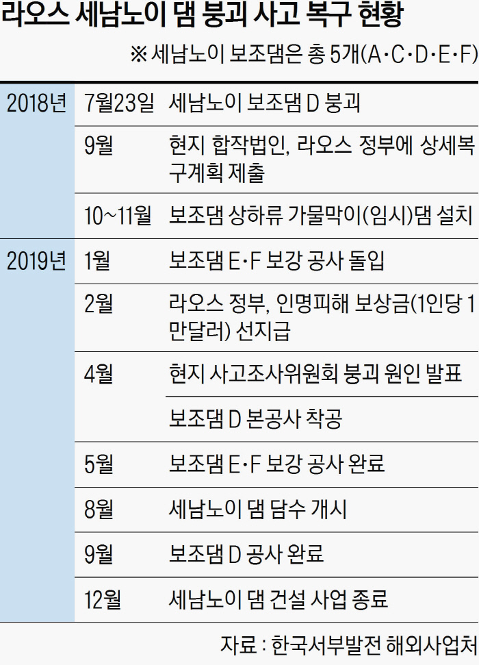 去年 7月23日セナムノ-イ貯水池淡水のために逐造した 5個の補助ダム(A·C·D·E·F) 中暴雨で補助ダム Dが遺失されて約 5億tの水が放流されながら人命被害と財産損害が発生した. 事故以後 SK建設は最初 ‘フックデム’に設計された補助ダム Dを ‘コンクリートダム’に変えて来る 4月末着工に入って行く. それより先立ってラオス政府要請に従って技術者文士検討を経って今年 1月から補助ダム E·Fに対する安全性補強工事も進行の中だ. このような手続きを経ってセナムノ-イダム建設事業は来る 12月完了する予定だ.