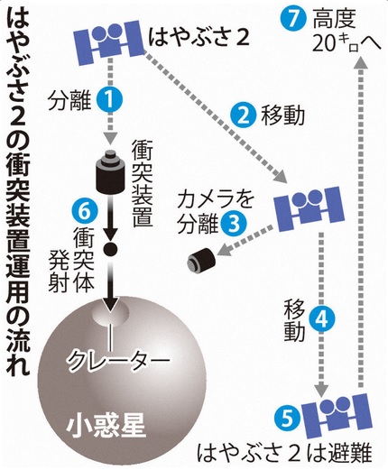 衝突装置にはタイマーが付いており、はやぶさ2が分離してから40分後に点火される。その間に、はやぶさ2は水平方向へ1キロ移動し、衝突実験の様子を撮影する小型カメラを午前11時14分ごろに分離、探査機はそのままリュウグウの裏側へ退避する。