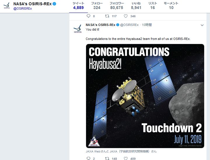 https://www.yomiuri.co.jp/science/20190711-OYT1T50251/【ワシントン=共同】宇宙航空研究開発機構(JAXA)の探査機はやぶさ2が小惑星りゅうぐうへの2回目の着陸に成功したことを受け、米航空宇宙局(NASA)の小惑星探査機オシリス・レックスのチームは11日、ツイッターで「やったね!おめでとう」と祝福した。