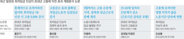 황선웅 부경대 교수는 지난해 말 <산업관계분석>에 실린 ‘최저임금 인상의 경제적 효과 분석’에서 2002년부터 2018년까지 최저임금 인상에 따른 고용효과를 분석한 결과 최저임금 인상이 고용률에 부정적 영향을 줬다는 증거는 발견되지 않았고 경기변동이 영향을 줬다는 결론을 내렸다. 황 교수는 “경기변동을 고려하지 않고 보면 최저임금의 영향으로 고용이 마이너스로 보이겠지만, 경기변동 변수를 고려하면 최저임금만으로 고용감소가 일어났다고 보기 어렵다”며 “제조업, 도소매, 숙박음식, 시설관리, 교육 중 어느 산업에서도 통계적으로 유의미한 부정적 고용효과가 발견되지 않았다”고 밝혔다. 황교수는 반면 “저임금 노동자 실질임금 증가율은 최저임금 인상에 따라 큰 폭으로 증가했다”고 밝혔다.