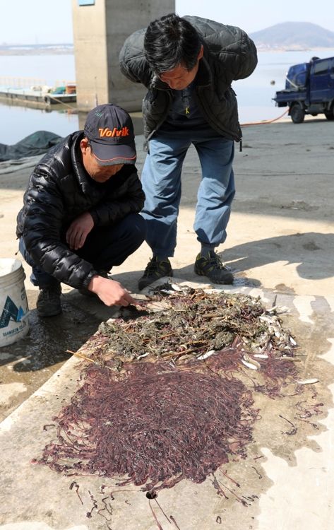 今月5日、漁師の兪栄九(ユ・ヨング)(71)氏は「同日、朝にかけて掲載した網にうなぎは5∼6匹だけで、残りは全部ヒモ虫だった」、「今年も春とともにヒモ虫が現れ、心配」と話した。