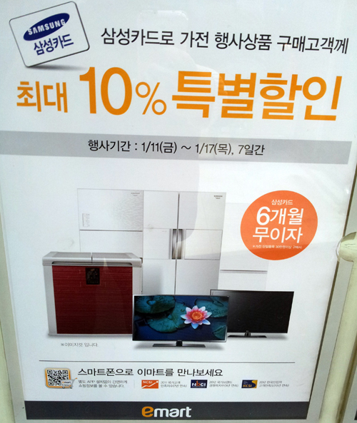 'samsung 카드로 가전제품 구매시에 최대 10% 할인. 6개월 무이자'로 기록되어 있다.