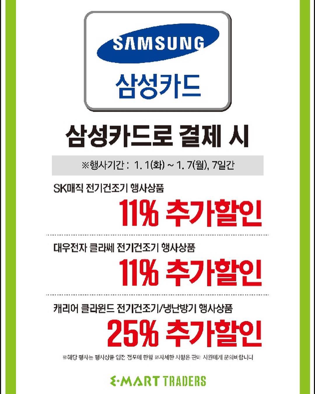 'samsung 카드로 구매시, 전기건조기 11% 추가할인, 냉난방기 25% 추가할인' 으로 표시되어 있다.