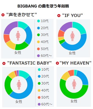 同じ BIGBANG の曲であっても、曲ごとに歌う年齢層が大きく異なるのは面白いですね。(JOYSOUND うたスキデータより)