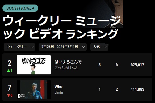 youtube Music charts アーティスト別動画再生数のうち、「韓国国内で」再生されている回数。