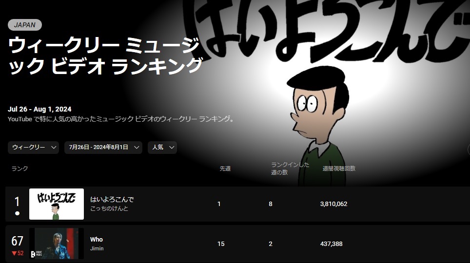 日本の曲は、動画アップ後4ヵ月未満で上位20位以内に5曲も入っているのに。