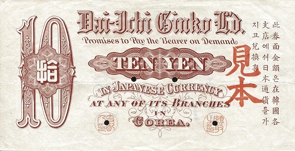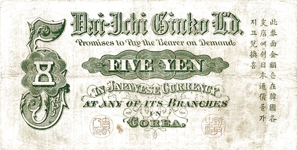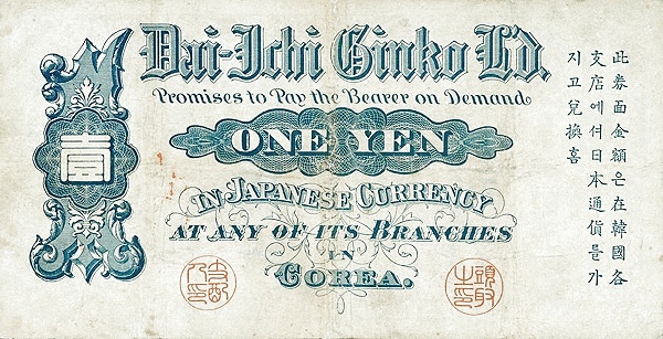 1902年(明治35年)当時の朝鮮政府公認紙幣「渋沢の肖像画入り第一銀行券」を発行。事実上の朝鮮の中央銀行の役割を担う事となった。