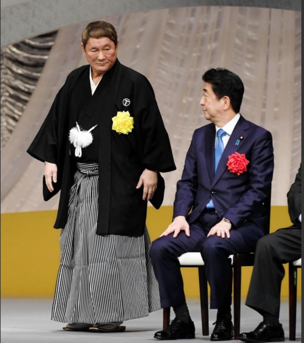 紋付き袴姿で登場すると、まずはマイクに頭をぶつけるボケ。「え~祝辞。衆議院…あ、こっちじゃない」と別の書面を読み上げるボケを続けて、笑いを誘うと、「はにほへと…あ、こっちだ」とボケを連発。3年前のお茶会で両陛下と初めて接した際、「あなたの監督した映画を見ています」と述べられたことに触れ、「私の映画のことや身体(バイク事故のけが)のことまで知っていたんだと驚き、不思議な感動に包まれました」と話した。