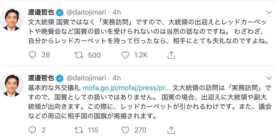 今回の文大統領の出迎え時の儀典や、晩餐会の有無を見ると〝準公式訪問〟っぽい。>>66