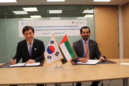 12日(現地時間)、米国ワシントン国際通貨基金(IMF)本部でイジュヨル韓国銀行総裁とUAE中央銀行知るマンスリ総裁が54億ドル(6兆1000億ウォン)規模のウォン/ディルハム通貨スワップ契約に署名した。