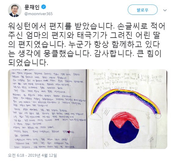 文大統領は12日午後に帰国した直後、ツイッターで「ワシントンである母親の手書きの手紙と太極旗(韓国の国旗)が描かれた娘の手紙を受けた」と伝え、手紙の写真を載せて内容を紹介した。