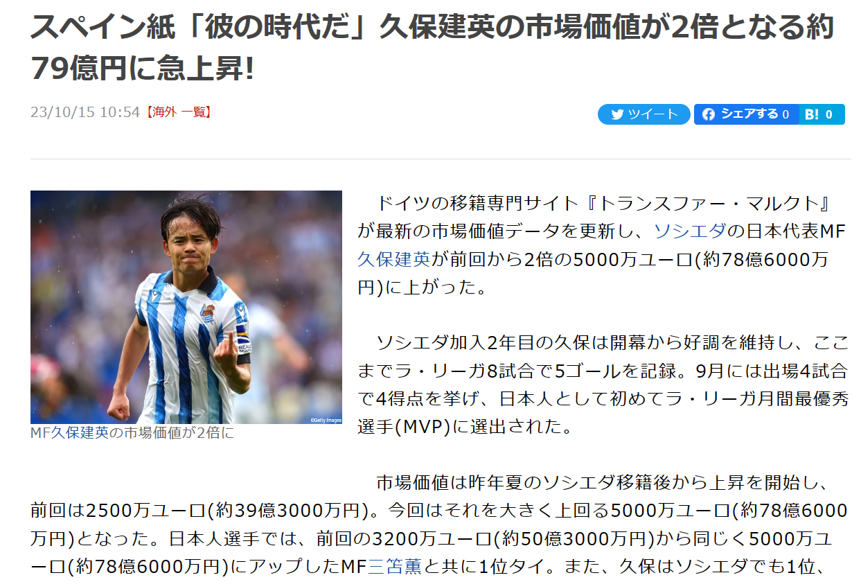 市場価値は昨年夏のソシエダ移籍後から上昇を開始し、前回は2500万ユーロ(約39億3000万円)。今回はそれを大きく上回る5000万ユーロ(約78億6000万円)となった。日本人選手では、前回の3200万ユーロ(約50億3000万円)から同じく5000万ユーロ(約78億6000万円)にアップしたMF三笘薫と共に1位タイ。また、久保はソシエダでも1位、ラ・リーガ全体では14位に位置している。