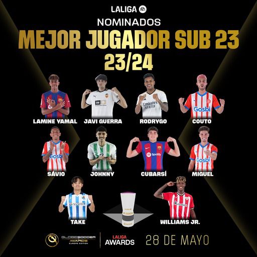 次に、LALIGA賞のU23最優秀選手賞は、以下の10人の才能ある若者のうちの1人に贈られる: ラミン・ヤマル(FCバルセロナ)、ハビ・ゲラ(バレンシアCF)、ロドリゴ(レアル・マドリード)、クート(ジローナFC)、サビーニョ(ジローナFC)、ジョニー(レアル・ベティス)、クバルシ(FCバルセロナ)、M・グティエレス(ジローナFC)、ニコ・ウィリアムズ(アスレティック・クラブ)、久保(レアル・ソシエダ)。この賞は、LALIGAのスポンサーであるソラーレによって提供される。2023-24シーズン ラリーガのTOTSに選出