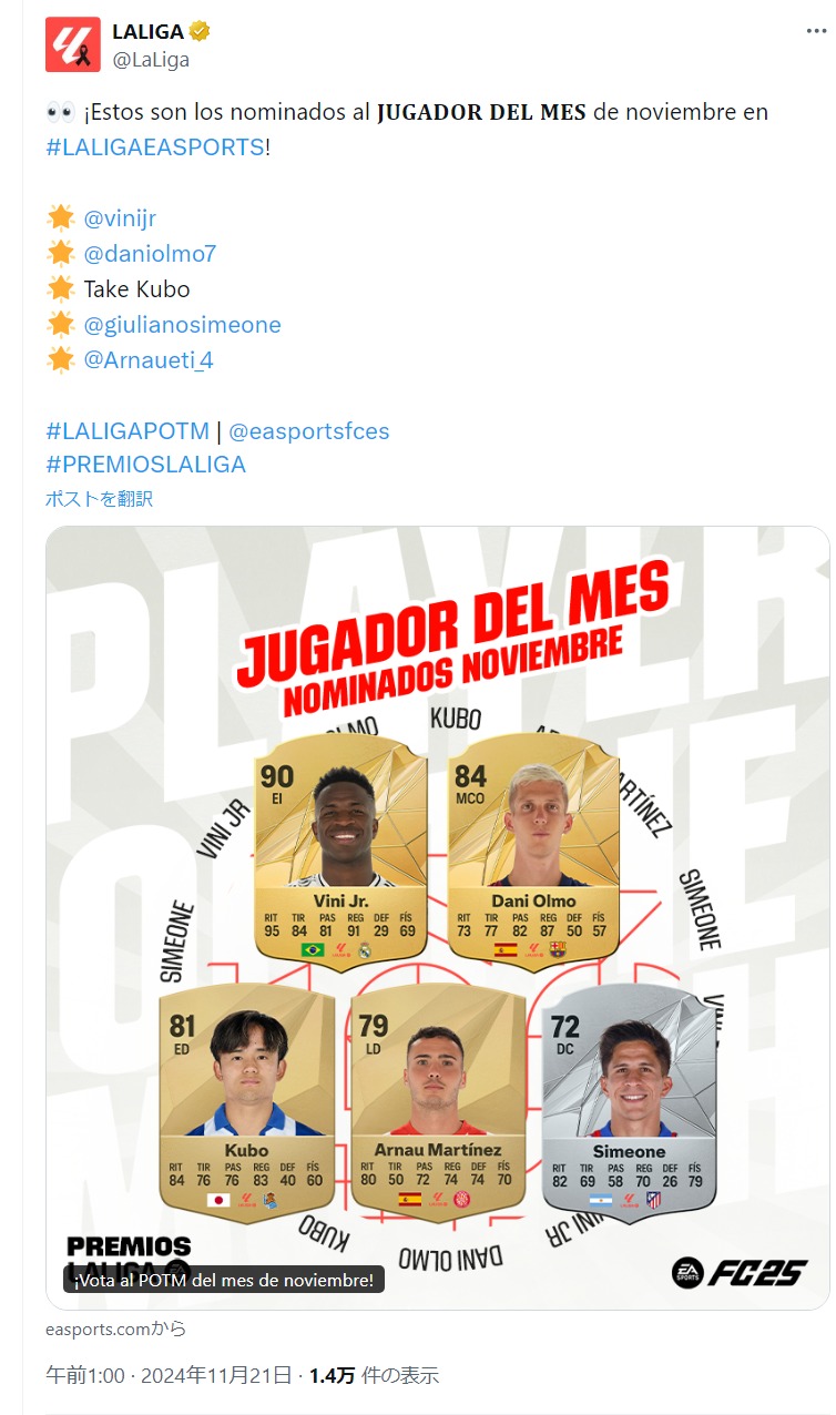 https://web.gekisaka.jp/news/world/detail/?418235-418235-fl2024-25 ラ・リーガ公式 11月の月間MVP候補に選出される