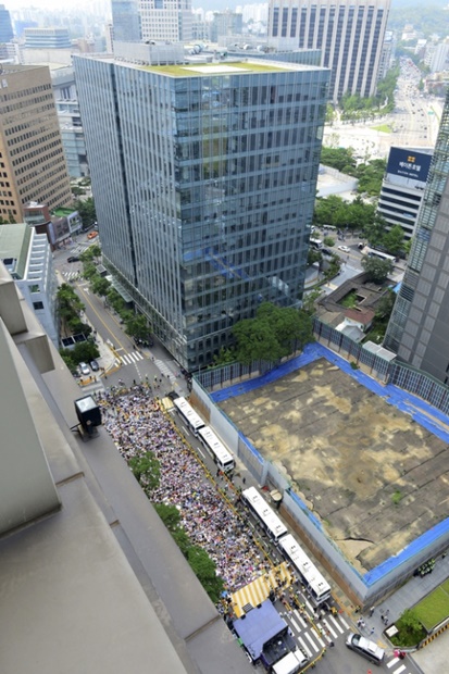 「こちら交通量の多いソウル中心部の光化門(カンファムン)の交差点です。信号待ちをしている車を見ますと、フロントガラスから中の様子が見えない車がかなり多く見受けられます」
