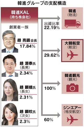 韓進グループの頂点に立つ韓進KAL(持ち株会社)の株式は、趙亮鎬(2019/4/7に死亡)17.84%。長男、長女、次女はそれぞれ2%、KCGIは13.47%