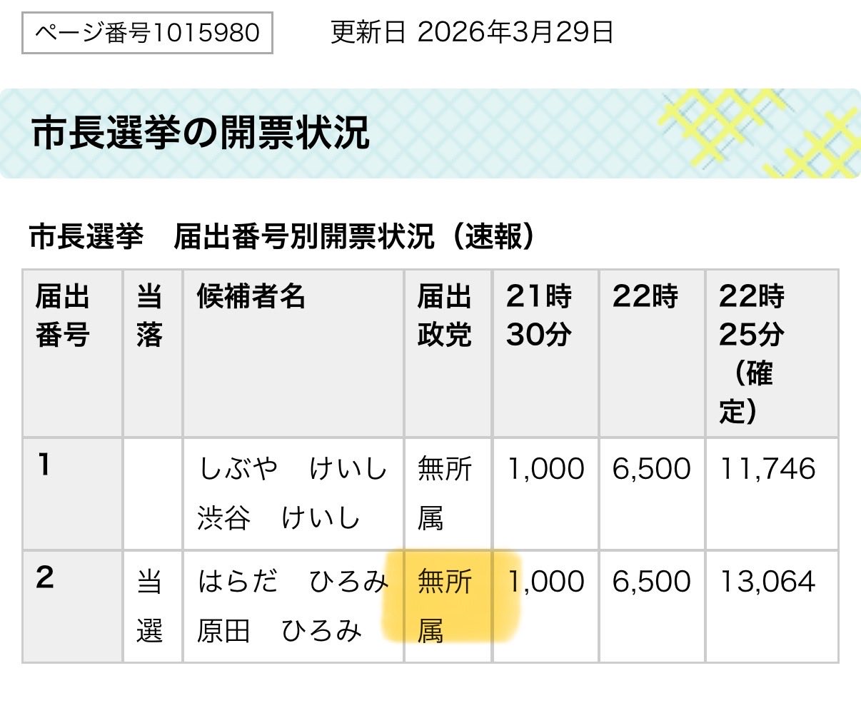 両氏の一騎打ちで、得票は原田氏1万3064票、渋谷氏1万1746票。投票率は40・18%だった。
