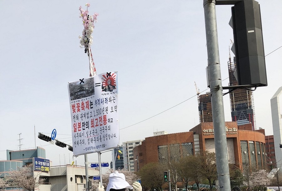 ・満開の桜が灰色のソウル市内を春の色に染めていた4月7日、汝矣島・輪中路に、桜の木は日程残滓だから、抜くべきだという看板を持った人がいた。