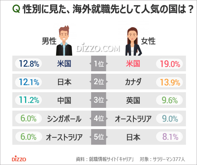 求職者の半分に近い46.9%が、海外で就職するなら米国がいいと答え、以下、日本、カナダ、ベトナムの順で続いた。性別に見た、海外就職先として人気の国はどこなのか、詳しく見てみよう。
