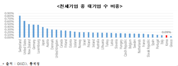 韓国の大手企業の割合が、経済協力開発機構(OECD)国家のうち最下位圏であることが分かった。大企業の割合が今より高くなると252万の雇用が創出されることができるという分析だ。