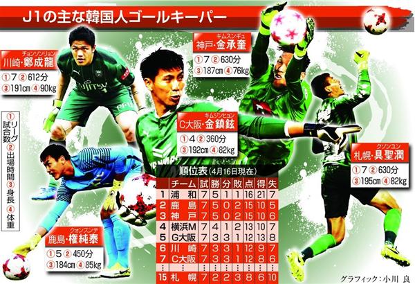http://efight.jp/news-20170425_259518『(サッカー)韓国人守護神、Jリーグを席巻 長身と運動能力を兼備、5選手がレギュラーに』