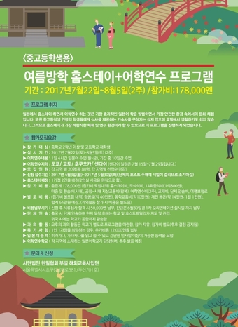 중고등학생이 오는 7월 22일부터 8월 5일까지 2주 단기 어학연수를 하고 일본 생활 문화를 체험하는 것을 목적으로 이 프로그램이 마련되었다.