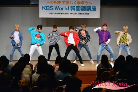 韓国語講座の前にアーティストとしての魅力に触れるべく、教材となる彼らの楽曲「She」を含む、2曲をパフォーマンス。約200名の受講者の応援にライブ会場さながらの盛り上がりを見せた。