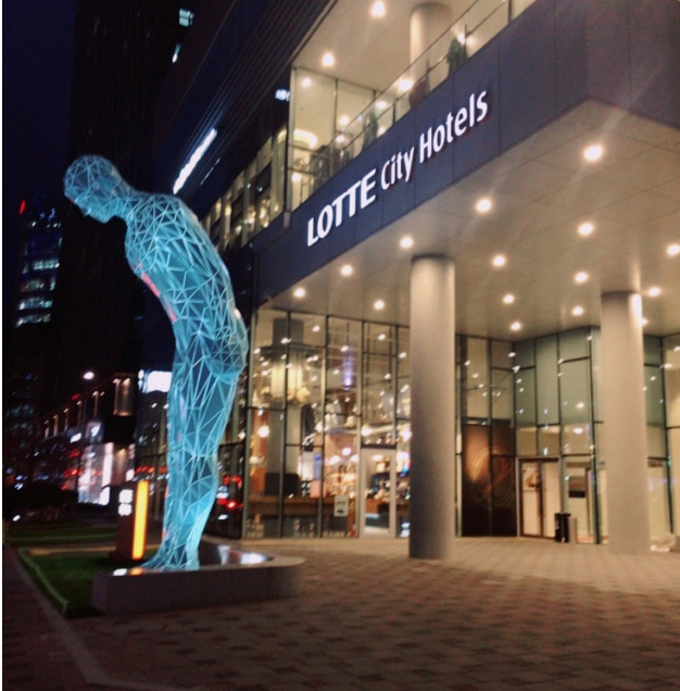 写真は、ソウルロッテホテルの巨大な彫刻像「グリーティング・マン(Greeting Man)」